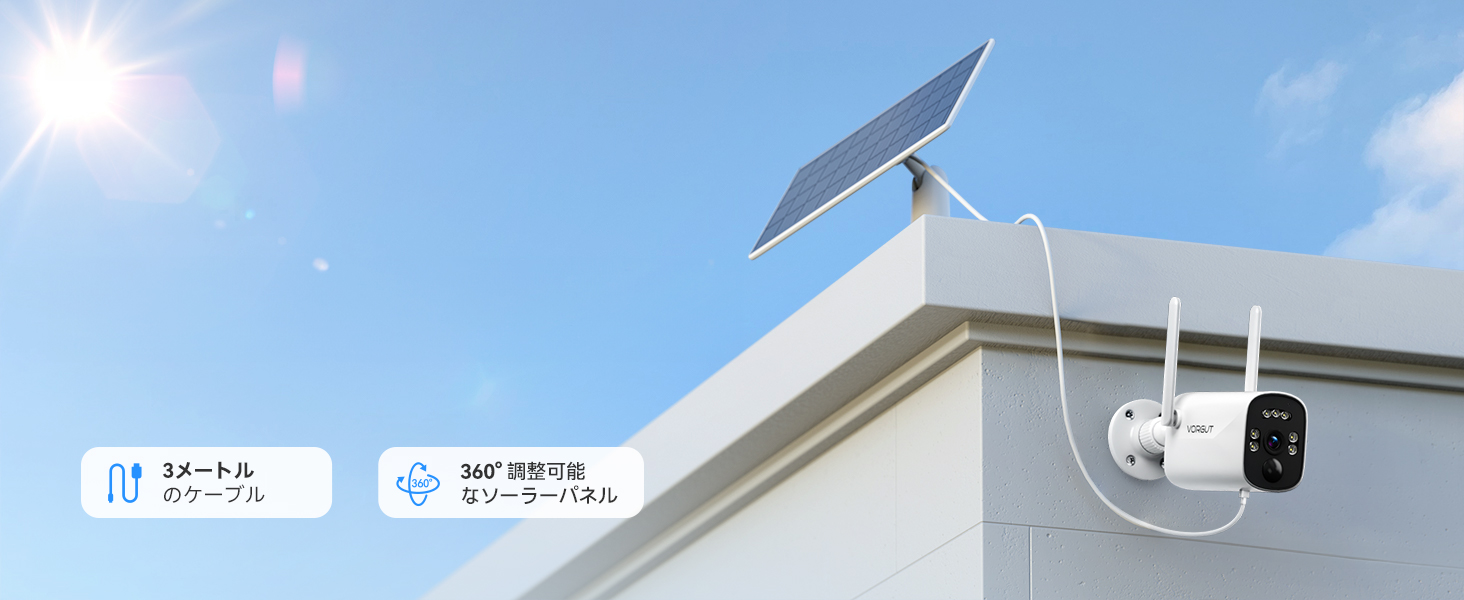 Charged by sunlight! Easy to install with a 3m cable, this security camera is equipped with a solar panel that can be freely adjusted to any angle of 360°, allowing you to keep a close eye on your important places.